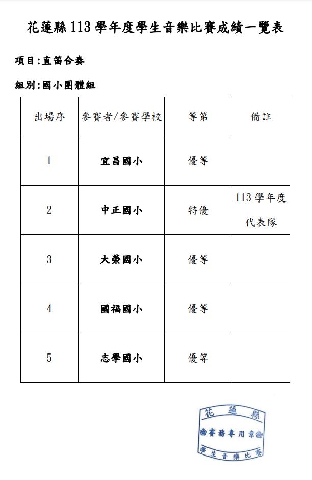 恭賀本校榮獲花蓮縣113學年度學生音樂比賽國小團體組直笛合奏「優等」