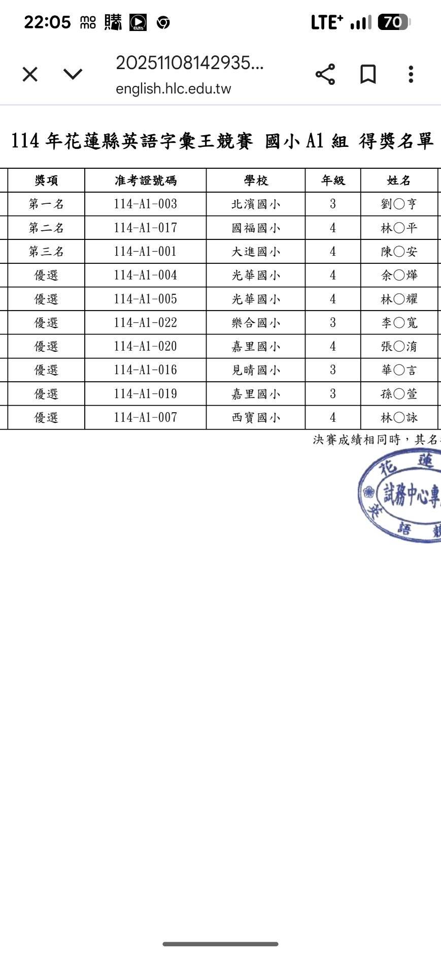 ~賀~114 年花蓮縣英語字彙王競賽 四年級林軒平同學 國小 A1 組 第二名