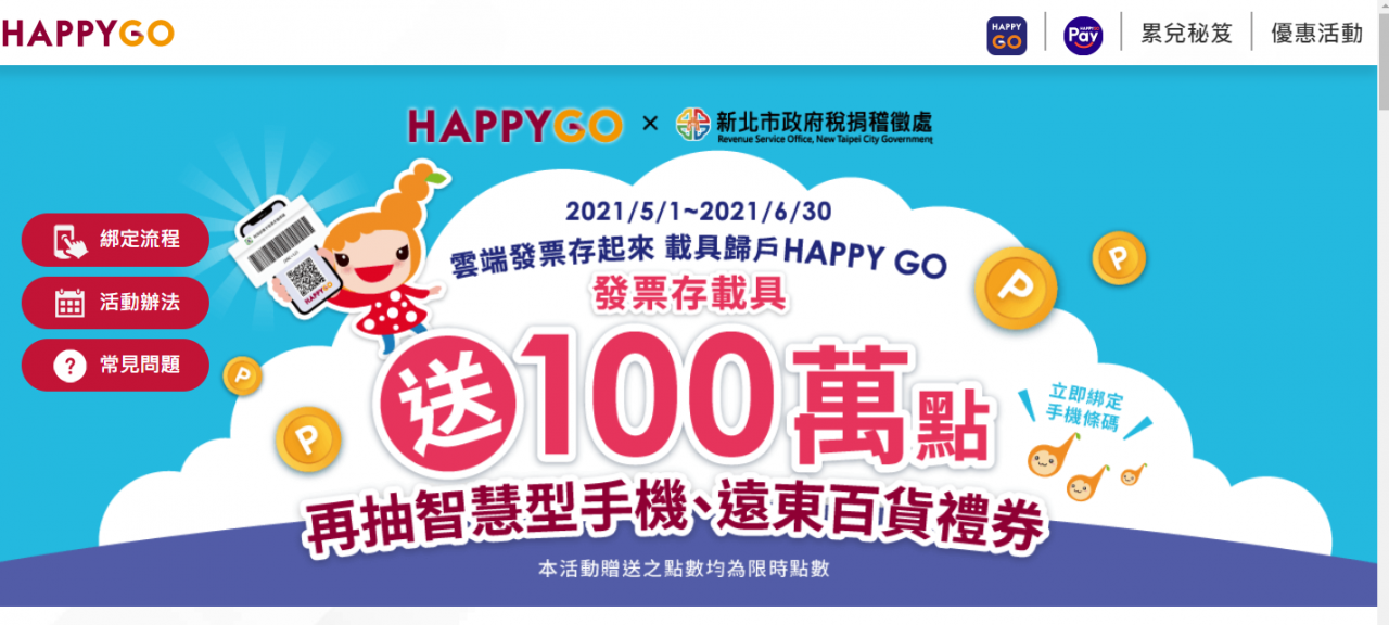 (一) | 首次下載「HAPPY GO」APP 完成會員登入即贈 50 點,使用「HAPPY GO」APP 綁定手機條碼再贈 50 點,最高可獲得 HAPPY GO 限時點數 100 點。 |