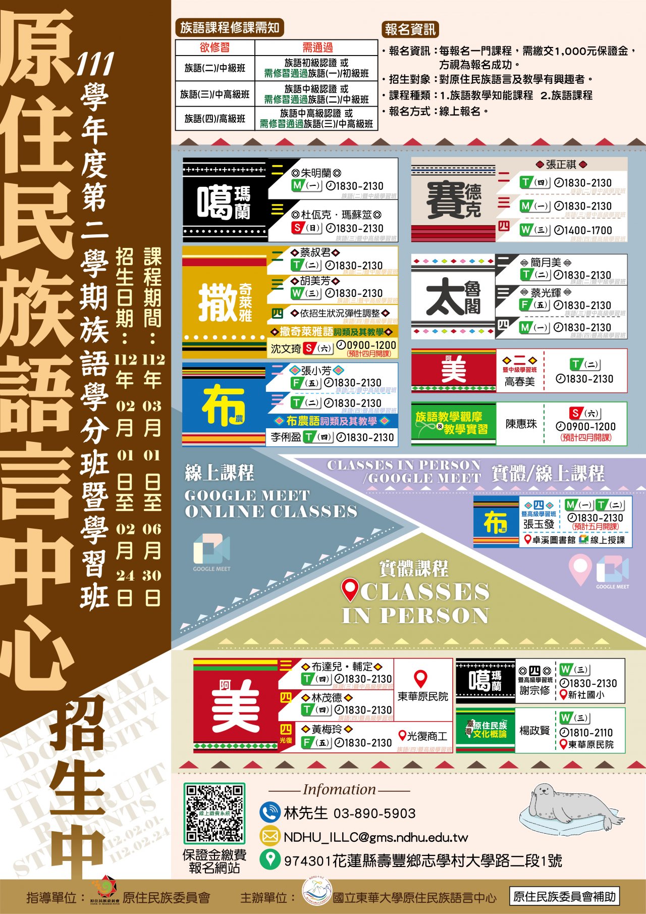 報名方式:詳見簡章,採保證金繳費報名制,每門課程壹仟元,課程修畢即可退費。線上繳費及報名網址: https://web.ndhu.edu.tw/GA/onlinepay/pay.aspx